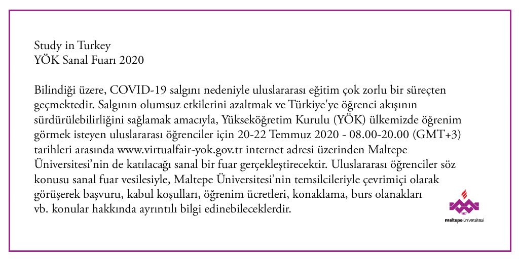 Maltepe Universitesi On Twitter Higher Education Council Yok Will Host A Virtual Fair Between July 20 To 22 2020 For International Students Who Wish To Study In Turkey From 8 00 A M To